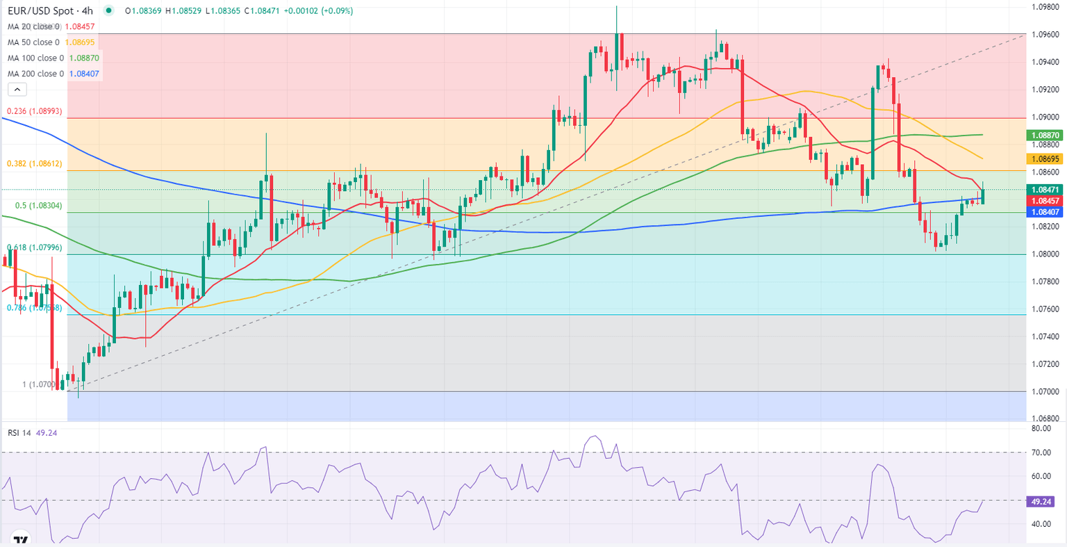 Immediate support is located at 1.0840-1.0830 (200-period SMA, Fibonacci 50% retracement) ahead of 1.0800 (Fibonacci 61.8% retracement).