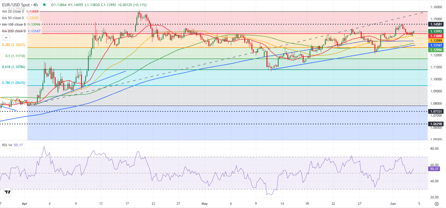 On the upside, 1.1450 (static level) aligns as the first immediate resistance level before 1.1500 (static level, round level) and 1.1575 (April 21 high). Looking south, supports could be seen at 1.1380 (Fibonacci 23.6% retracement of the latest uptrend), 1.1320 (200-period Simple Moving Average) and 1.1300 (100-period SMA).