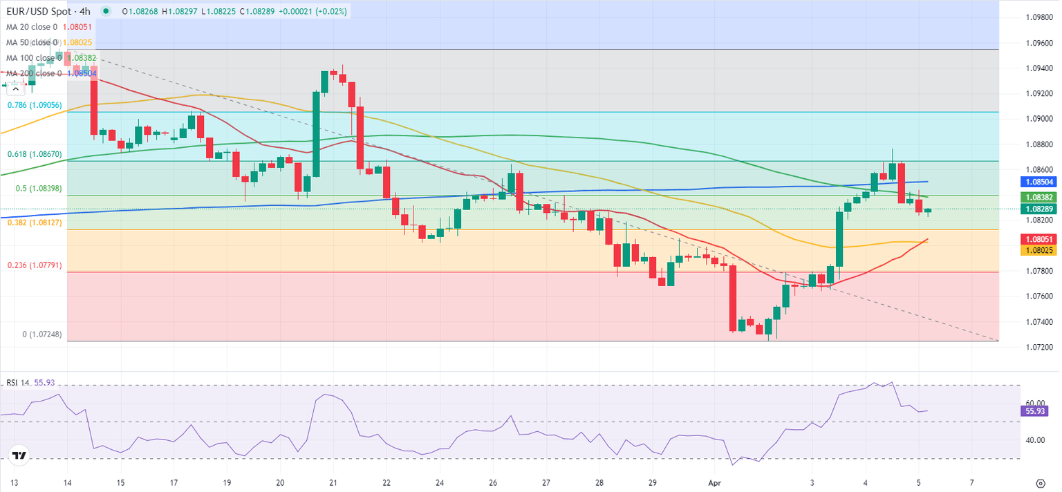 EUR/USD erased its daily gains and closed flat on Thursday after climbing to its highest level since March 21 above 1.0870. The pair fluctuates in a tight channel below 1.0850 in the early European session on Friday as investors gear up for the US labor market data.