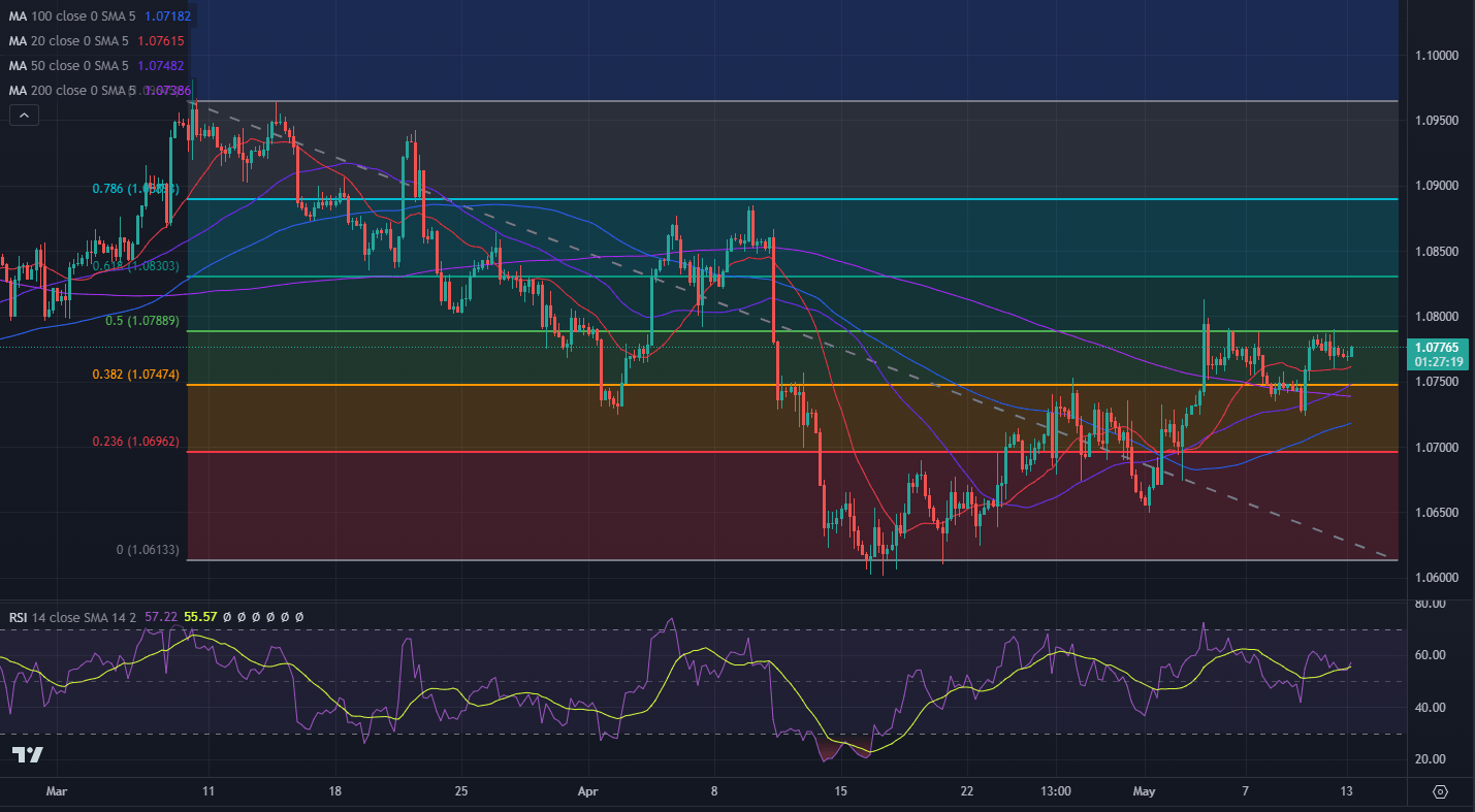 EUR/USD faces key resistance at 1.0790-1.0800 (Fibonacci 50% retracement of the latest downtrend, psychological level). If the pair manages to stabilize above this region, 1.0830 (Fibonacci 61.8% retracement) and 1.0900 (Fibonacci 78.6% retracement) could be seen as next hurdles.