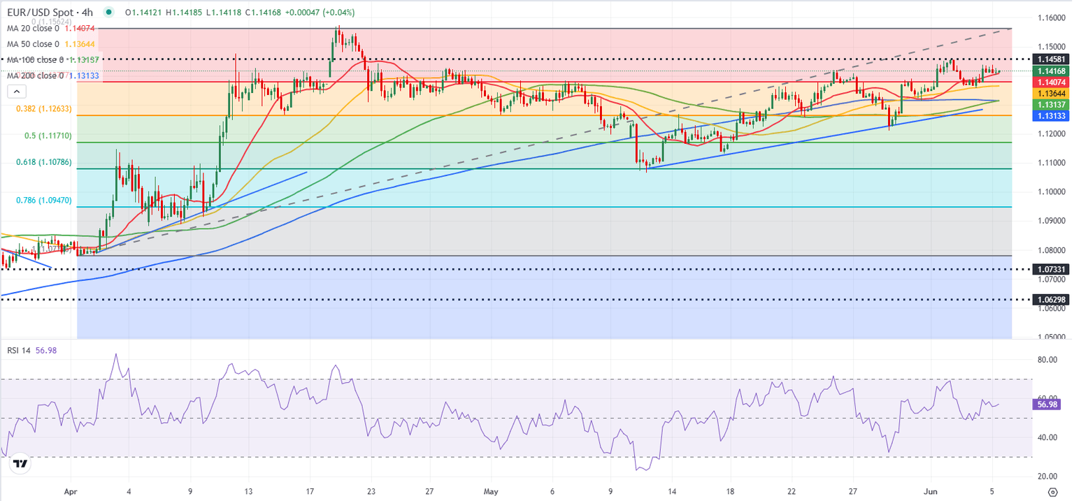- EUR/USD fluctuates in a tight range slightly above 1.1400 on Thursday.