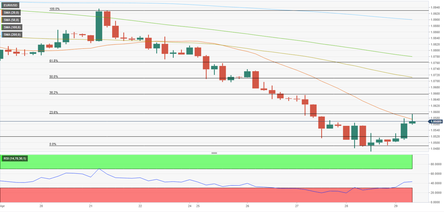EUR/USD started the last trading day of April on firm footing and has advanced beyond 1.0550 after having closed the previous six trading days in negative territory. The pair faces the next hurdle at 1.0600 and it could target 1.0660 next if that level turns into support.