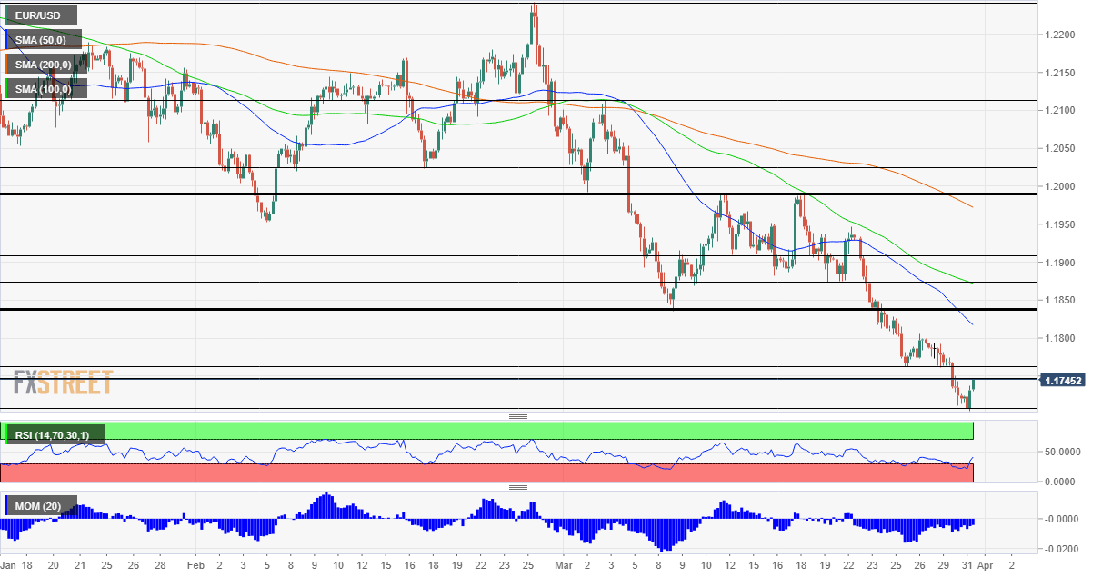 The four-hour chart continues showing a downtrend since the currency pair hit a high of 1.2250 in late February. Momentum remains to the downside and EUR/USD trades below the 50, 100 and 200 Simple Moving Averages. Moreover, the Relative Strength Index (RSI) climbed above the 30 levels, thus exiting oversold conditions and allowing for additional falls.