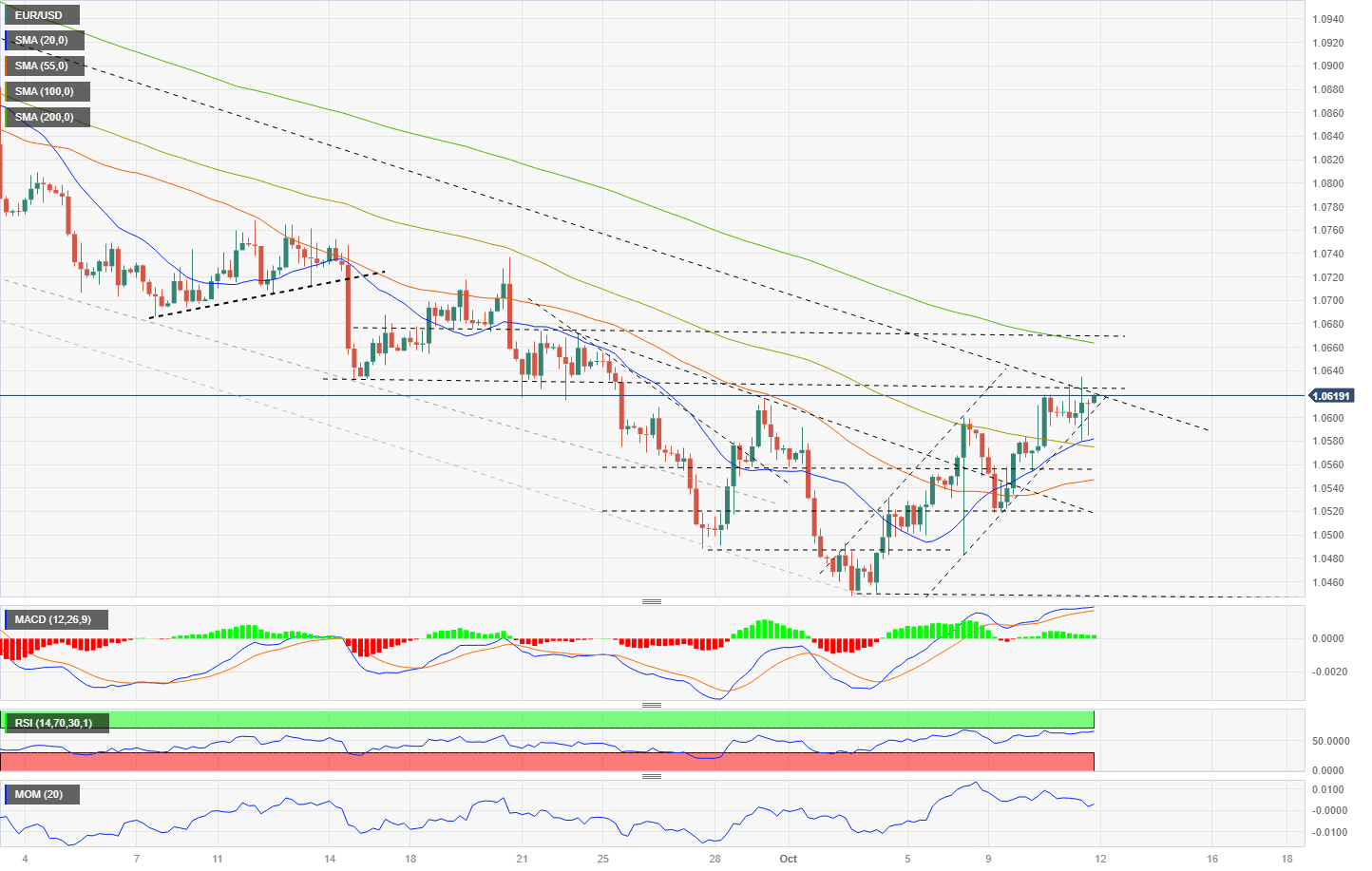The EUR/USD is consolidating above the 20-day Simple Moving Average (SMA), but it is facing resistance at the crucial 1.0630 resistance area. The chart shows scope for more gains, with the Relative Strength Index (RSI) and Momentum moving higher. However, the overall trend remains downward.