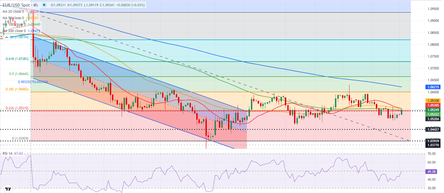 EUR/USD was last seen trading near 1.0520, where the 100-period Simple Moving Average (SMA) on the 4-hour chart meets the Fibonacci 23.6% retracement of the latest downtrend. If this level stays intact as resistance, the pair could push lower toward 1.0440 (static level) and 1.0400 (end-point of the downtrend).