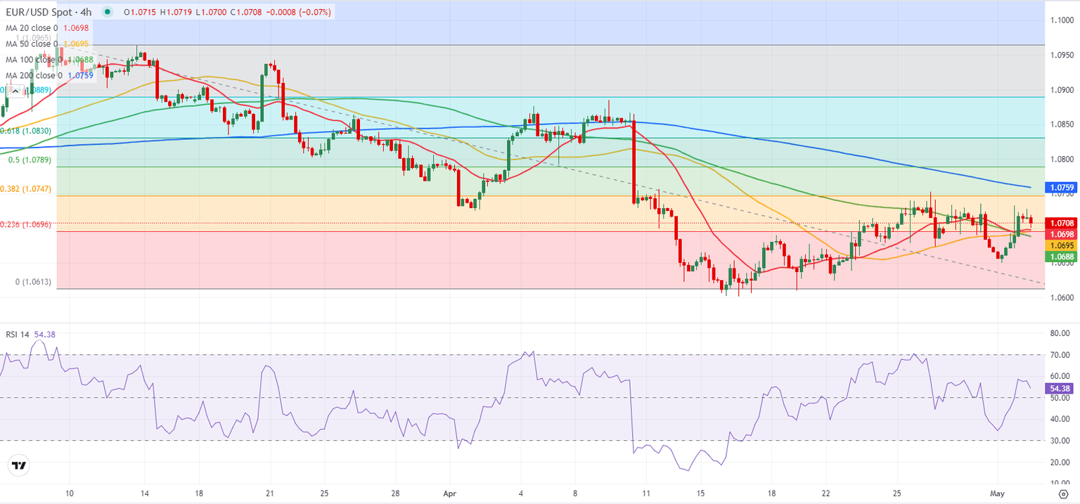 1.0700 (Fibonacci 23.6% retracement, 100-period SMA, 50-period SMA) aligns as immediate support before 1.0650 (static level) and 1.0600 (static level).