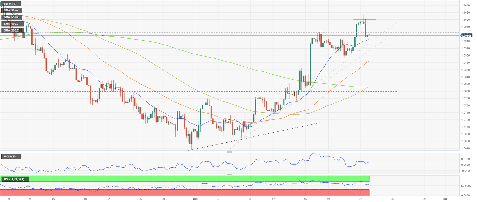 The EUR/USD hit the highest level in months at 1.1011 but failed to hold above 1.1000 and corrected to the 1.0950 area. The recovery of the US Dollar pushed the pair to the downside. Expectations from the European Central Bank (ECB) were offset by Federal Reserve (Fed) Chair Powell's testimony, suggesting that more rate hikes are likely.