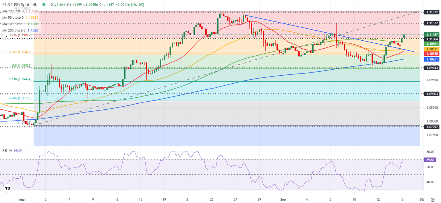 EUR/USD broke above the descending trend line coming from late August and the pair closed the last 4-hour candle above the 100-period Simple Moving Average (SMA). Additionally, the Relative Strength Index (RSI) indicator holds comfortably above 60, reflecting the bullish bias.