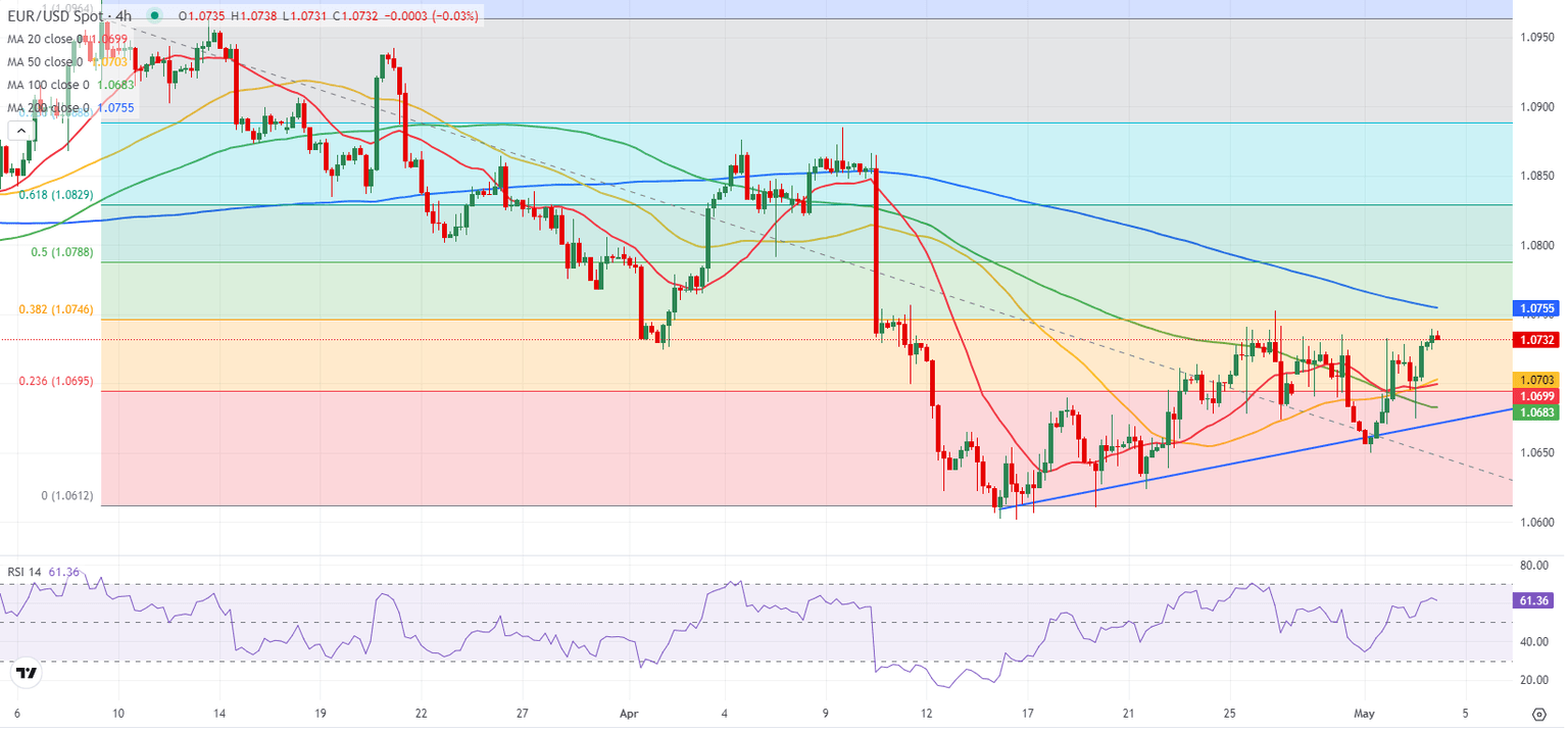 EUR/USD gained traction in the second half of the day on Thursday and closed in positive territory. The pair stays in a consolidation phase above 1.0700 early Friday as investors gear up for the last high-impact data release of the week, April jobs report from the US.