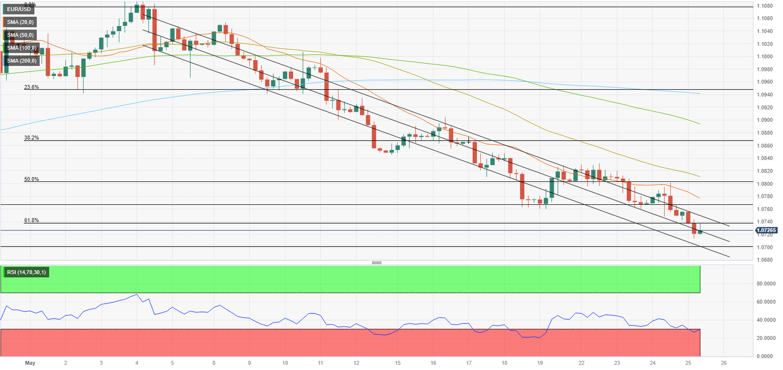 The Relative Strength Index (RSI) indicator on the four-hour chart dropped into the oversold territory below 30 on Thursday. Additionally, EUR/USD manages to hold slightly above the mid-point of the descending regression channel coming from early May. The upper-limit of the channel forms first resistance at 1.0750 ahead of 1.0770 (static level, 20-period Simple Moving Average (SMA)) and 1.0800 (Fibonacci 50% retracement of the latest uptrend, 50-period SMA).