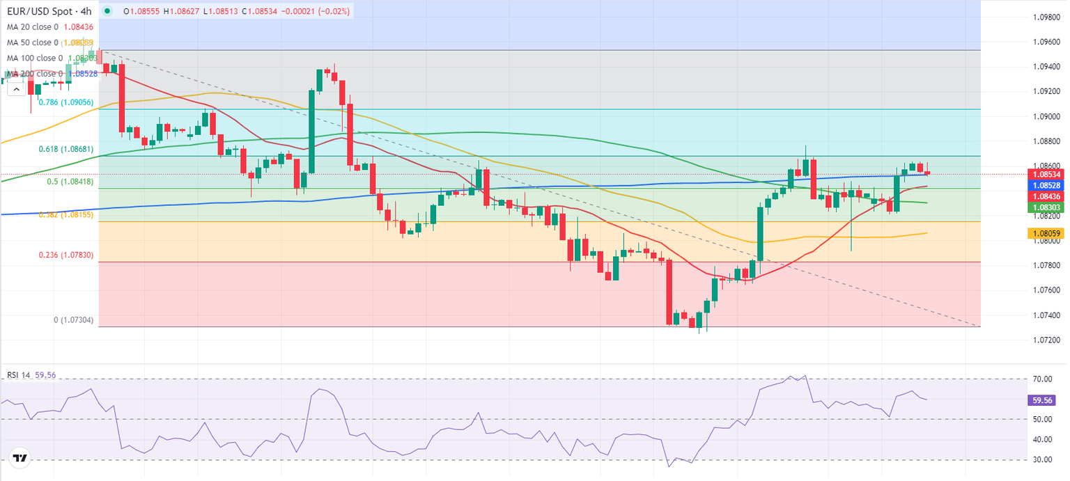 EUR/USD trades near 1.0850, where the 200-period Simple Moving Average (SMA) on the 4-hour chart is located. Above this level, the Fibonacci 61.8% retracement of the latest downtrend aligns as stiff resistance at 1.0870. If the pair manages to flip this level into support, it could target 1.0900 (Fibonacci 78.6% retracement) next.