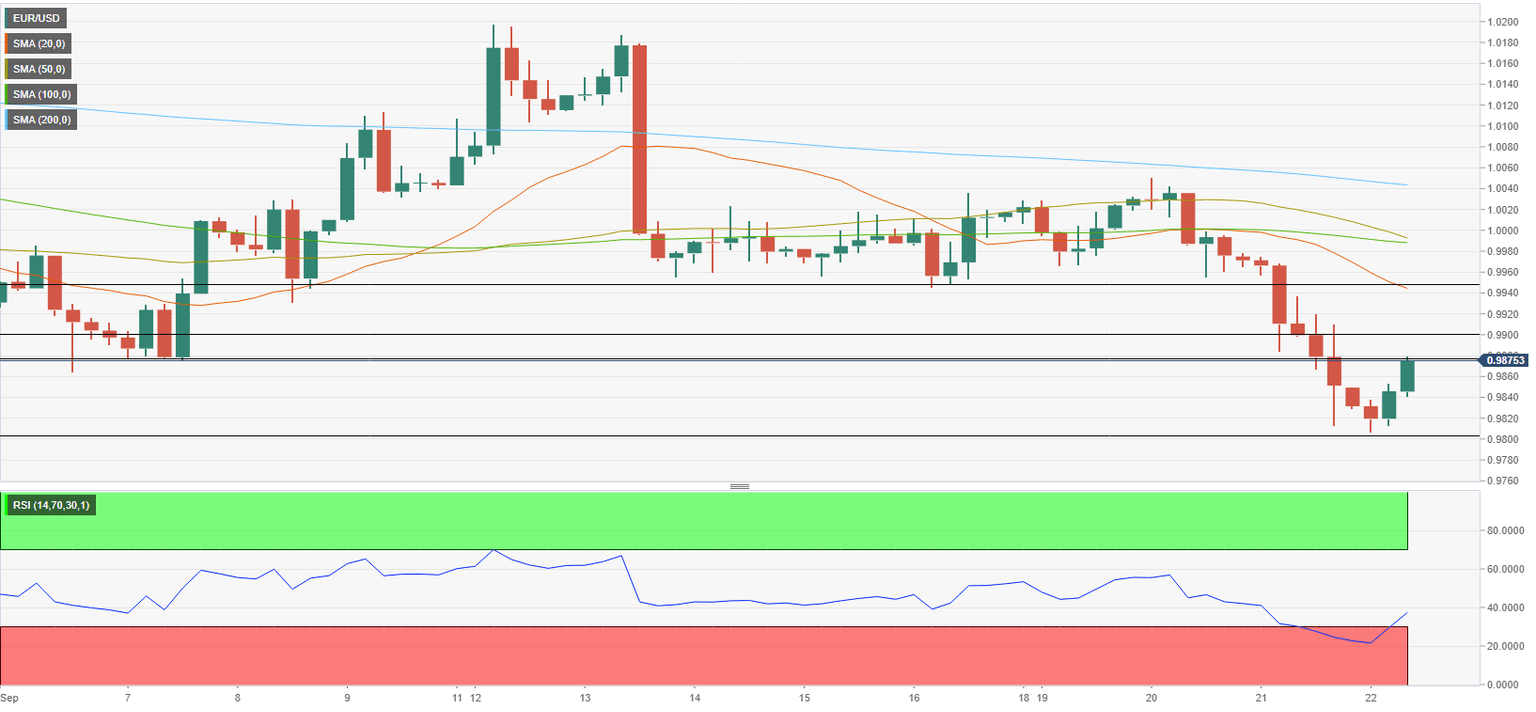 After having touched its lowest level since October 2002 at 0.9809 earlier in the day, EUR/USD has staged a rebound in the European session and turned positive on the day above 0.9850. In case the pair reclaims 0.9880 and starts using that level as support, it could extend its recovery in the near term.