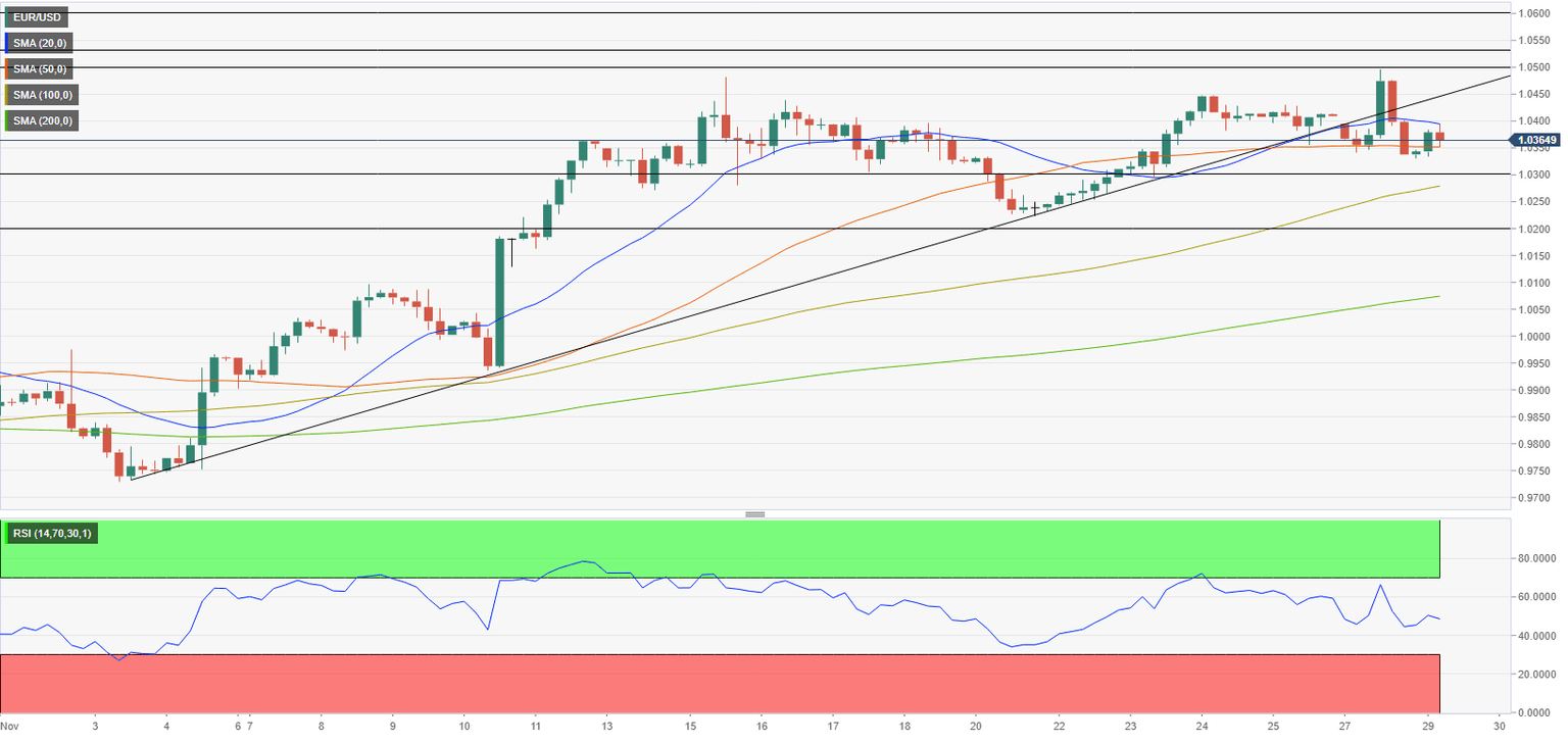 The 20-period Simple Moving Average (SMA) on the four-hour chart aligns as interim resistance for EUR/USD ahead of 1.0450, where the ascending trend line is located. In case the pair rises above the latter and starts using it as support, it could target 1.0500 (psychological level, multi-month high set on Monday) and 1.0530 (static level).
