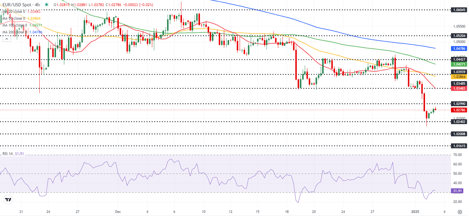 EUR/USD came under heavy bearish pressure on the first trading day of 2025 and dropped to its weakest level in over two years at 1.0224. Although the pair stages a rebound toward 1.0300 in the European morning on Friday, the technical outlook suggests that the near-term bias remains bearish.