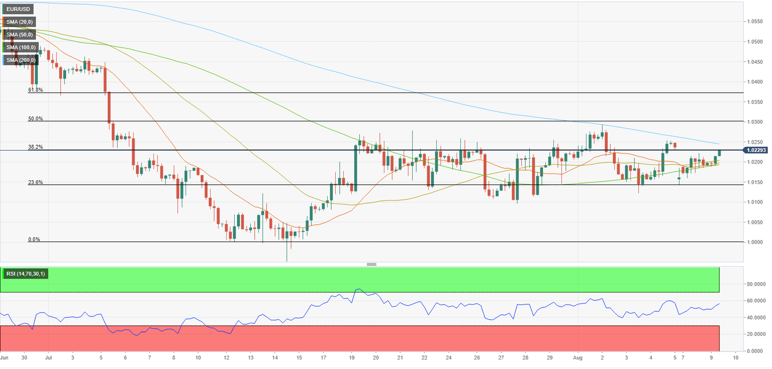 After having registered modest gains on Monday, EUR/USD has stretched higher in the early European session and climbed above 1.0200. Ahead of the inflation data from Germany and the US on Wednesday, however, market participants could refrain from betting on further euro strength.