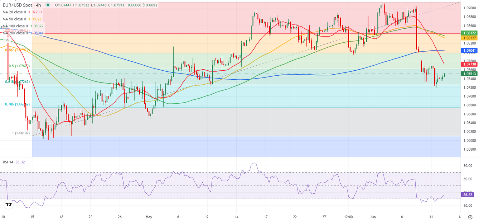 The Relative Strength Index (RSI) indicator on the 4-hour chart stays well below 50 despite the latest rebound, suggesting that EUR/USD is in a correction phase. On the upside, 1.0760 (Fibonacci 50% retracement of the latest uptrend) aligns as immediate resistance before 1.0790-1.0800 area, where the Fibonacci 38.2% retracement level meets the 100-day and the 200-day Simple Moving Averages (SMA), and 1.0850 (static level, 100-period SMA on the 4-hour chart).