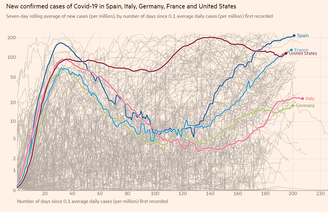 Israel, which initially depressed the disease, begins its second lockdown – the first country in the world to do so. Several European nations cannot rule that any longer. Pressure on hospitals is Madrid is growing and may trigger severe local restrictions. Other cities and countries are looking with worry at the Spanish capital.
