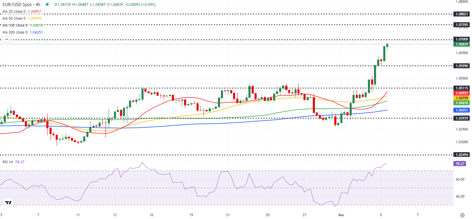 The Relative Strength Index (RSI) indicator on the 4-hour chart stays well above 70, reflecting overbought conditions. On the upside, 1.0700 (round level, static level) aligns as immediate resistance before 1.0760 (static level), and 1.0800 (static level, round level).