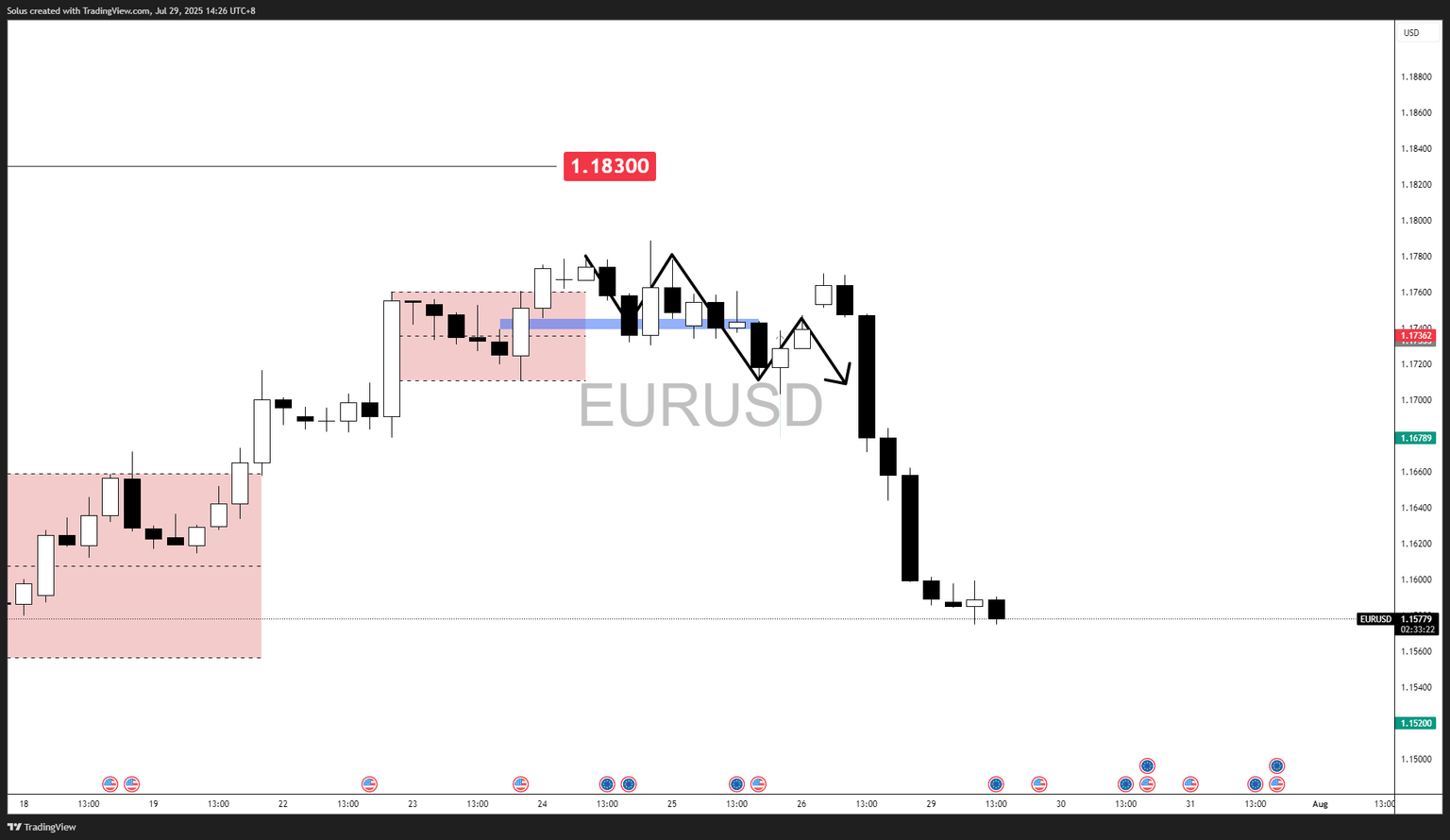 After sweeping liquidity above the 1.1780 level, EUR/USD failed to hold its gains and reversed sharply, breaking back below at extreme price ranges 1.1600–1.1550. Prior to this move, it invalidate the 4H Fair Value Gap (FVG) resting between 1.17395-1.17457. This failure marked the start of a clean distribution structure, which has now accelerated lower, pushing the pair into deeper downside targets.