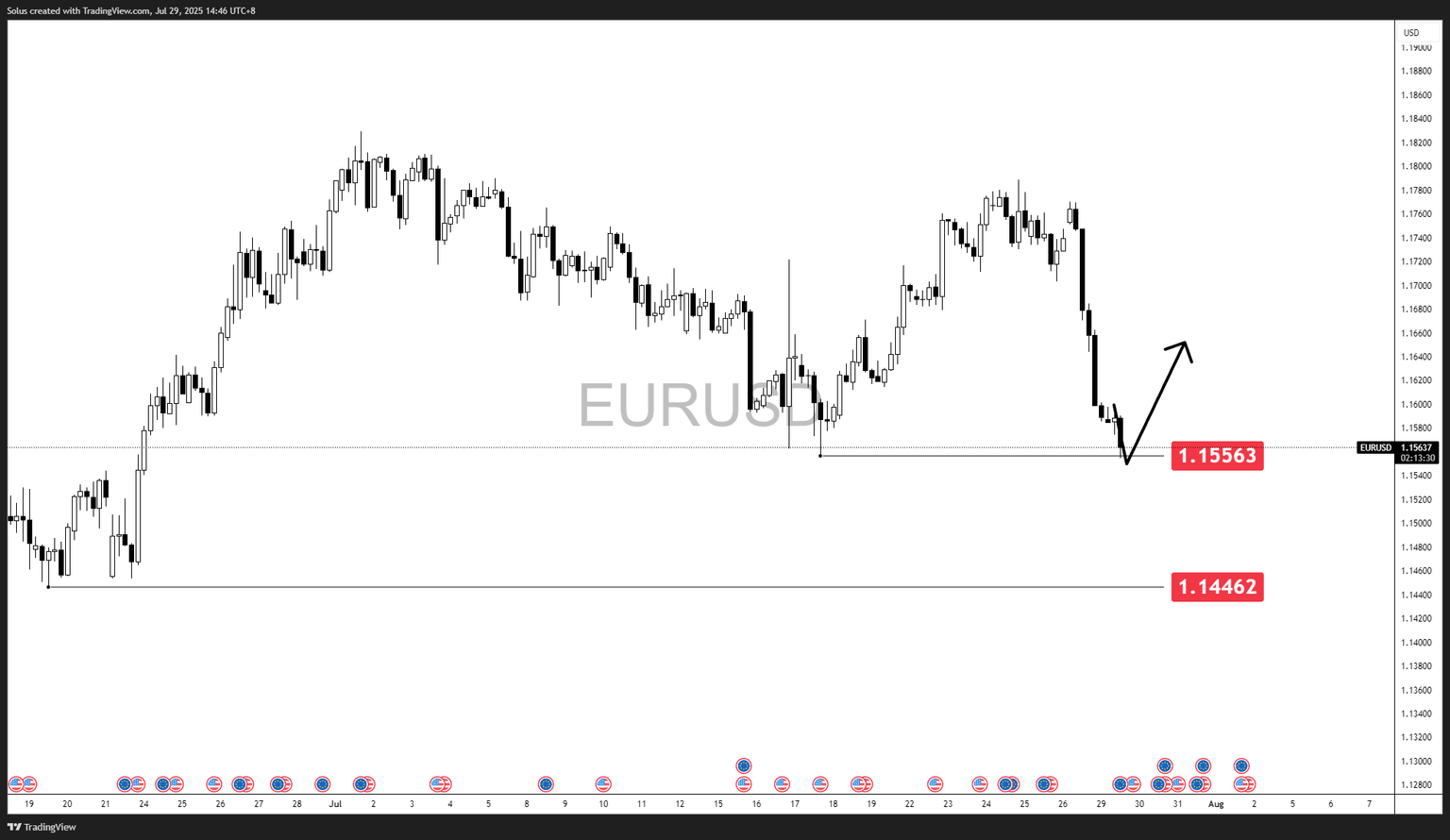 EUR/USD is sitting at a pivotal level around 1.1556, following a sharp breakdown from the 1.1790–1.1830 highs. Euro is currently testing the support level as Dollar continues to weigh down on Euro, making it a key decision point.