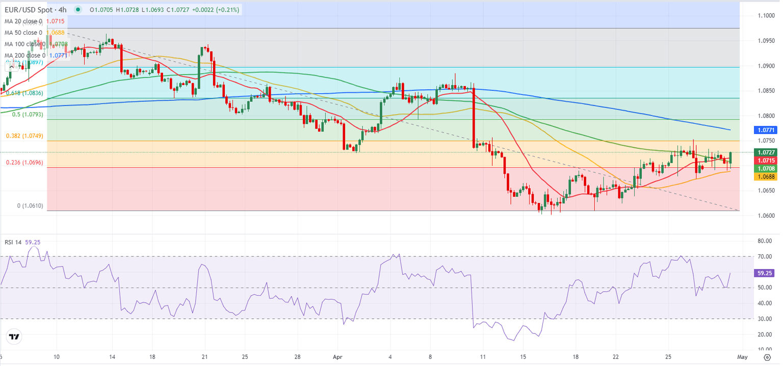 EUR/USD closed in positive territory on Monday but lost its traction in the early trading hours of the European session. After falling below 1.0700, however, the pair staged a rebound, supported by the latest data releases from the Euro area.
