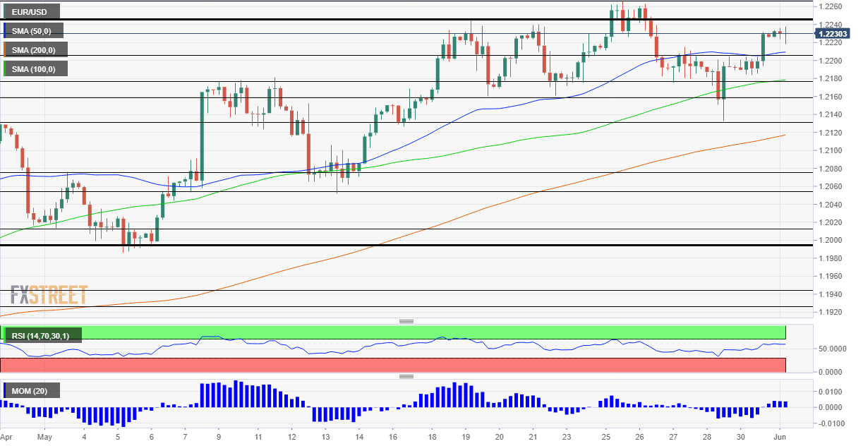 Some resistance awaits at 1.2245, the former triple top that capped EUR/USD in May. It is followed by the peak of 1.2266, and then by 1.23.