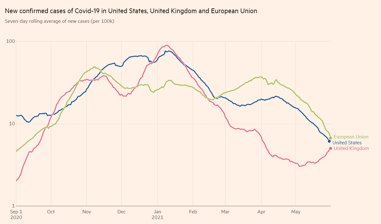 Roughly 40% of the old continent's population received one vaccine jab. The campaign is bearing fruit, as the chart below shows – Europe's trends are in the right direction.