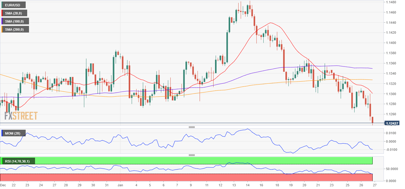 The daily chart for the EUR/USD pair shows that it trades near a fresh monthly low of 1.1238, with a firmly bearish stance. The pair has fallen for a third consecutive day after being unable to surpass its 20 SMA, which is currently turning south. Meanwhile, technical indicators offer firmly bearish slopes within negative levels.
