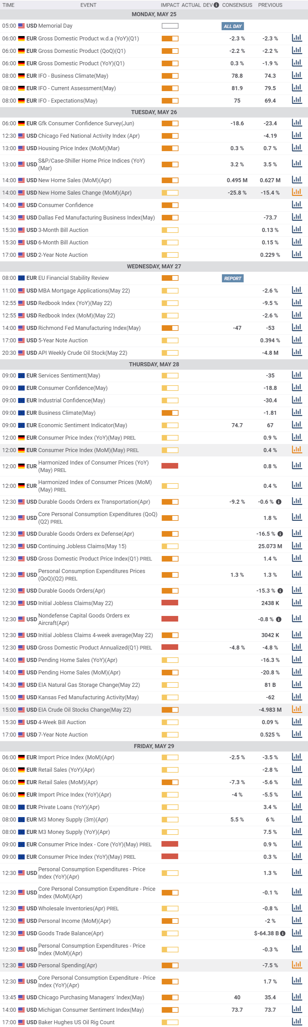 The upcoming week, Germany will release the final version of Q1 GDP, expected to be confirmed at -2.3%. The most relevant event coming from the EU will be May Consumer Confidence. The US will publish next Thursday when the country will release April Durable Goods Orders, expected to have fallen by 18.1%, and the first revision of Q1 GDP, foreseen at -5.0%. The week will end with German Retail Sales, EU’s May CPI, and US core PCE inflation, all to be released next Friday.