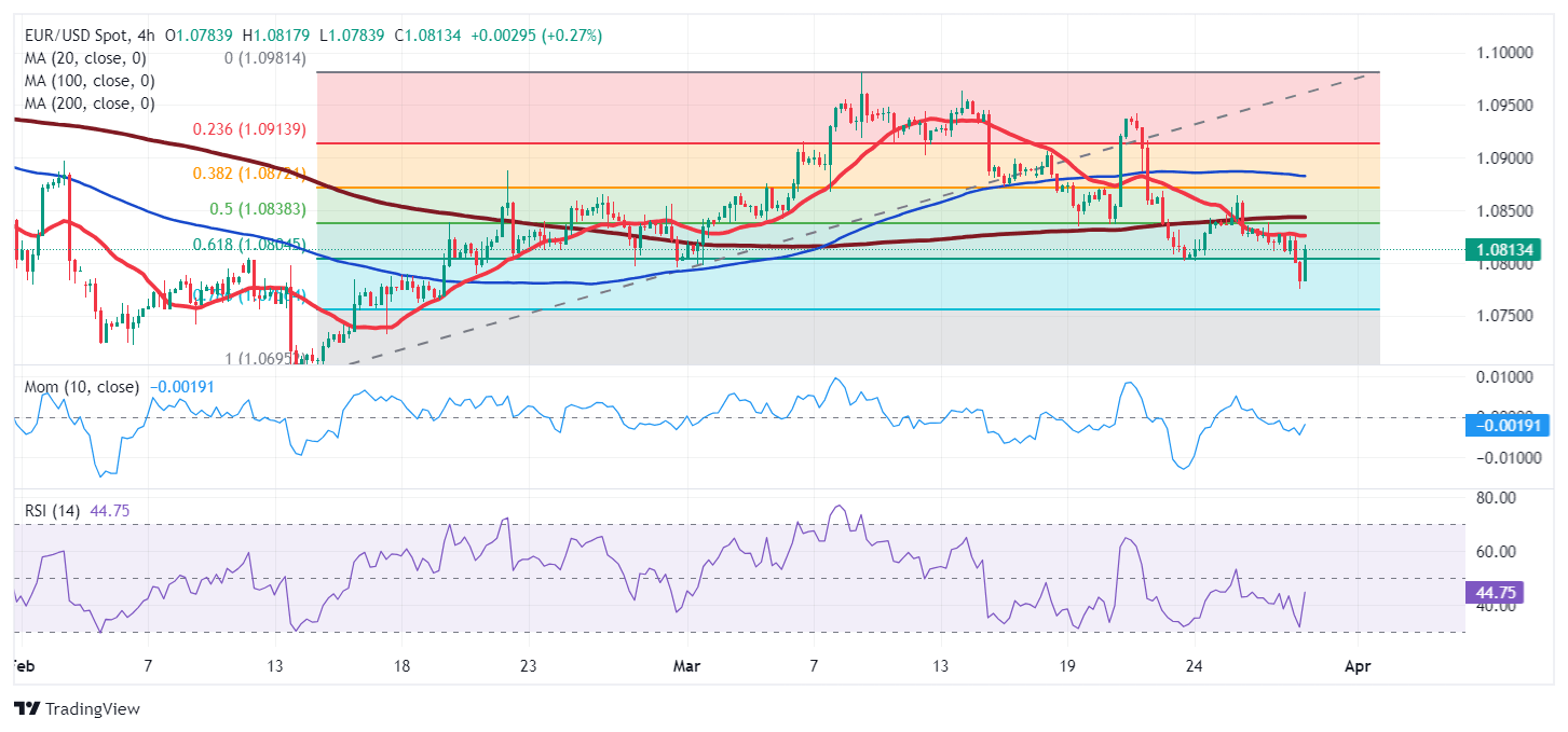 The US Dollar gained momentum in the mid-European session, pushing EUR/USD to a fresh one-month low of 1.0774. The decline accelerated after Germany reported Retail Sales fell 2.7% YoY in February, much worse than the 0.8% slide anticipated. Other than that, investors continue to act according to central bank officials´words, as upcoming rate cuts remain the main theme.