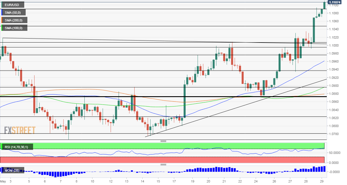 - EUR/USD has hit 1.11 – the highest since March – amid hopes for EU stimulus, dollar weakness.
