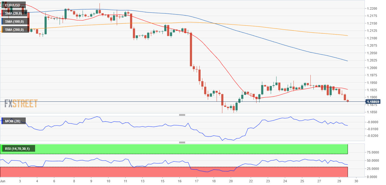 The EUR/USD pair is poised to extend its decline, after losing the 1.1920 level where the pair has the 61.8% retracement of its March/Mary advance. The 4-hour chart shows that a mildly bearish 20 SMA stands a few pips above the mentioned Fibonacci level, while the longer moving averages head firmly lower, far above the current level. Technical indicators accelerated their slides within negative levels, favoring a break through the recent lows in the 1.1840 price zone.