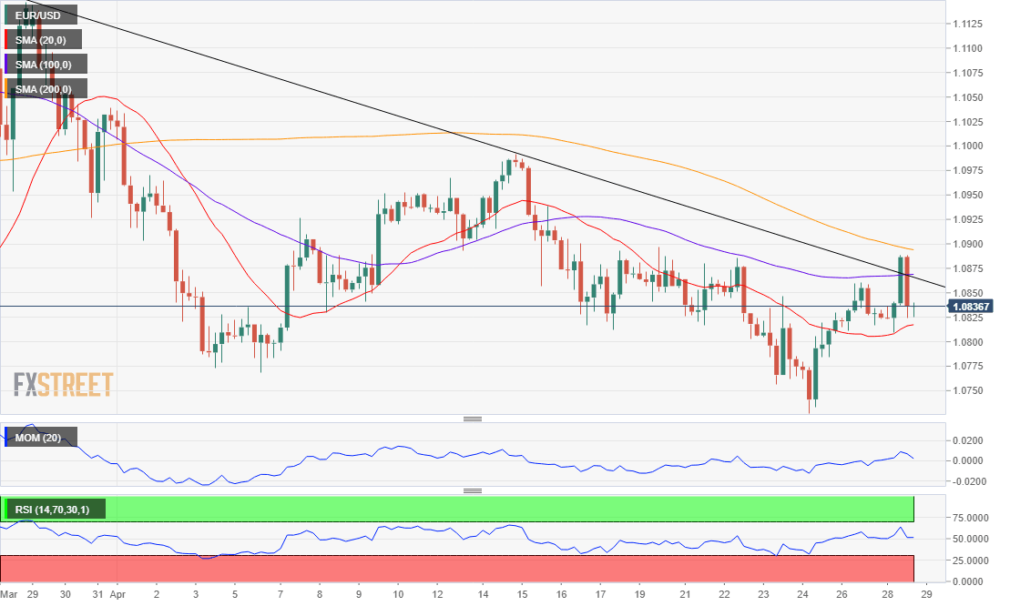 The EUR/USD pair has been unable to sustain gains beyond a daily descendant trend line coming from a late March high at 1.1147. The pair retains its neutral stance, quite normal ahead of the upcoming critical events. In the 4-hour chart, it remains confined between its 20 and 100 SMAM, while technical indicators eased within positive levels, now hovering around their mid-lines. The bullish potential will be clearer on a break above 1.0920, while the bearish case can gain adepts on a break below 1.0750.