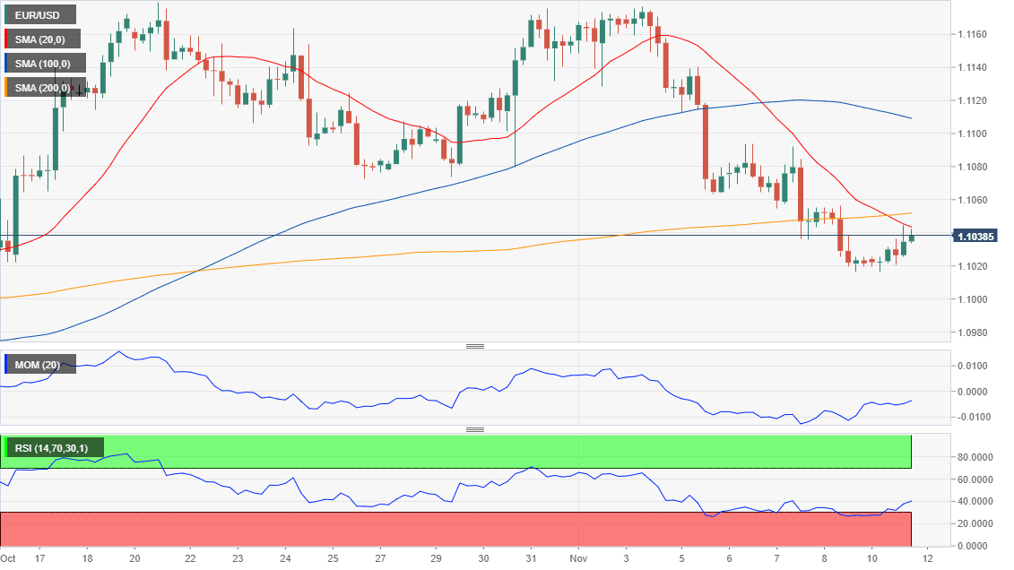 The EUR/USD pair has settled a few pips above the 50% retracement of its October rally in the 1.1040 price zone. The short-term picture is bearish, according to technical readings in the 4-hour chart, as the intraday advance stalled below converging 20 and 200 SMA, both providing dynamic resistance at around 1.1045. Indicators in the mentioned time-frame have corrected oversold conditions but lost strength upward within negative territory.