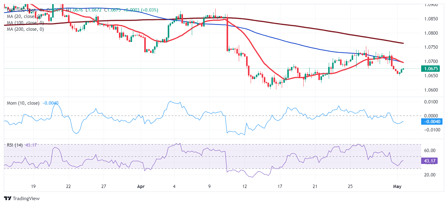 The EUR/USD pair fell to 1.0648 during Asian trading hours, later recovering towards the 1.0670 price zone, where it stays as American traders approach their desks. Wall Street closed in the red on the last trading day of April and kicked off the new month with a soft tone, as futures remain under selling pressure. Fears arose Tuesday after the US reported labor costs rose sharply in the first quarter of the year.