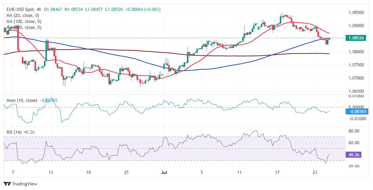 The EUR/USD pair extended its slide to 1.0824 on Wednesday, finally finding buyers in the area. The pair bounced towards the current 1.0850 price zone as the US Dollar came under modest selling pressure. Still, the Euro’s recovery has been limited by softer-than-anticipated local data.