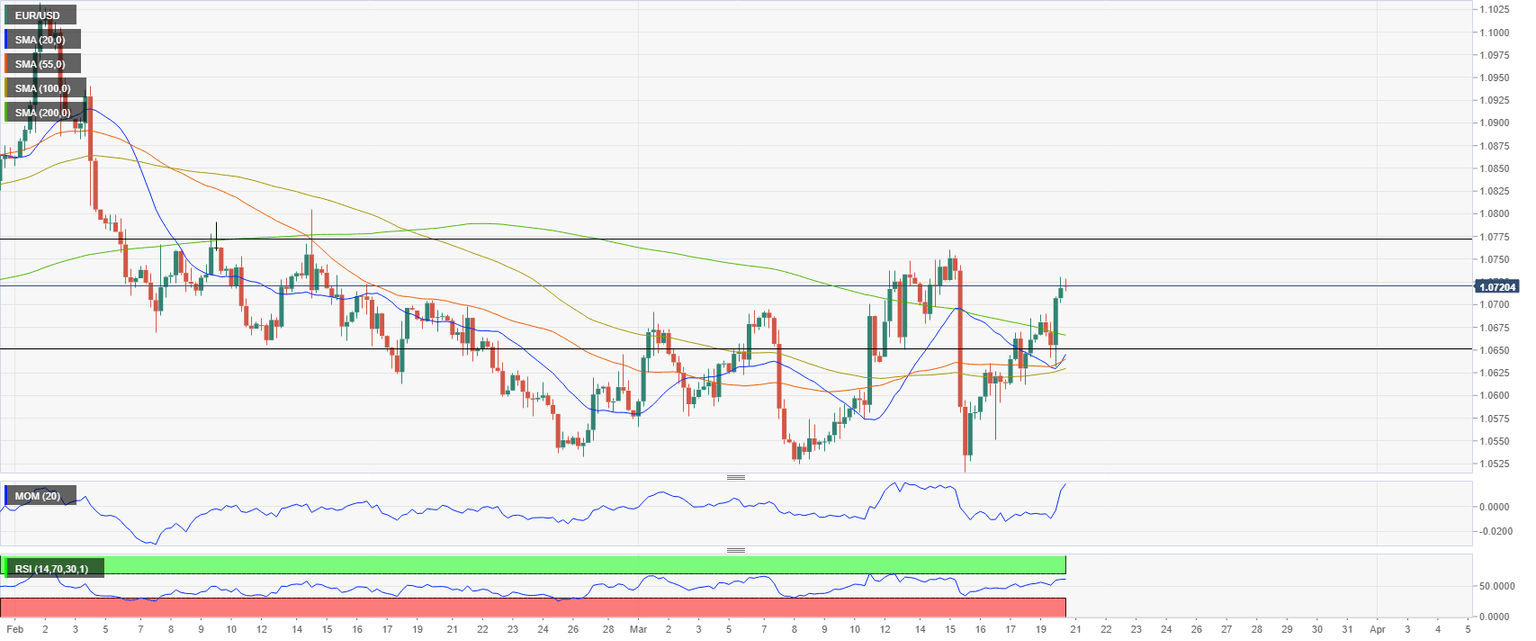 An improvement in market sentiment weighed on the US Dollar and pushed EUR/USD to the upside. The pair rose for the third day in a row, climbing back above 1.0700, and it is looking at last weekly highs. The EUR/USD pair turned positive for the month as the banking crisis persists and ahead of the FOMC meeting.