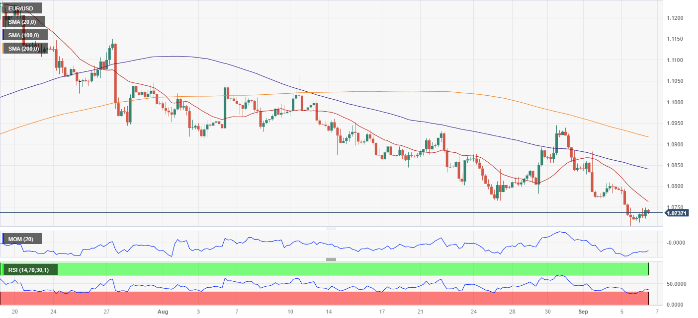 The EUR/USD pair trades in the 1.0730 price zone, and despite the intraday bounce, the risk remains skewed to the downside. In the daily chart, the pair comfortably develops below all its moving averages. The 100 and 200 Simple Moving Averages (SMAs) stand directionless well above the current level, but the 20 SMA heads firmly south between the longer ones. Technical indicators consolidate near oversold readings, giving up their downward momentum amid the recent bounce. Still, technical indicators are far from suggesting downward exhaustion while giving no signs of a directional shift.