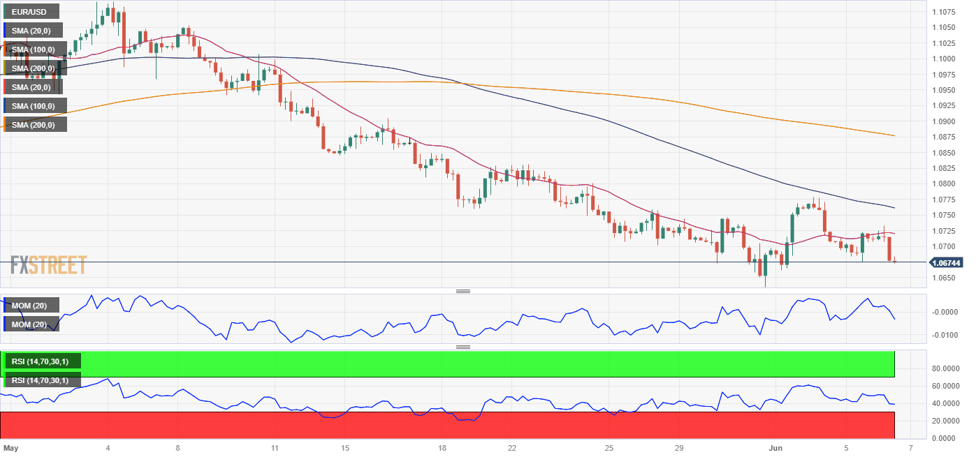 The EUR/USD pair peaked at 1.0732 early in the European session but eased from this level, trading below the 1.0700 threshold, as bulls find it hard to maintain the pressure. The mood is sour as the macroeconomic calendar continues to offer dismal figures. Following the poor services output indicators in the US released on Monday, Germany published April Factory Orders, which unexpectedly fell 0.4% MoM, and by 9.9% YoY, much worse than anticipated. Additionally, Eurozone Retail Sales were unchanged in April compared with the previous month, missing the 0.2% growth expected, while annual Retail Sales were down by 2.6%.