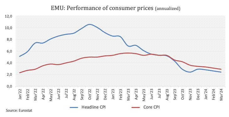 Around a potential ECB rate cut, flash inflation figures in the broader euro area showed the headline CPI rise by 2.4% in March and the Core CPI gain 2.9% over the last twelve months, both prints coming in below estimates and adding to Tuesday’s disinflationary pressures in Germany, after the CPI rose by 2.2% from a year earlier.