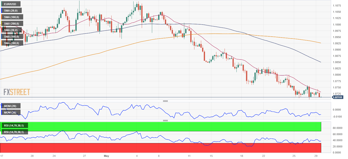 - EUR/USD consolidates at the bottom of its latest range with a bearish bias.