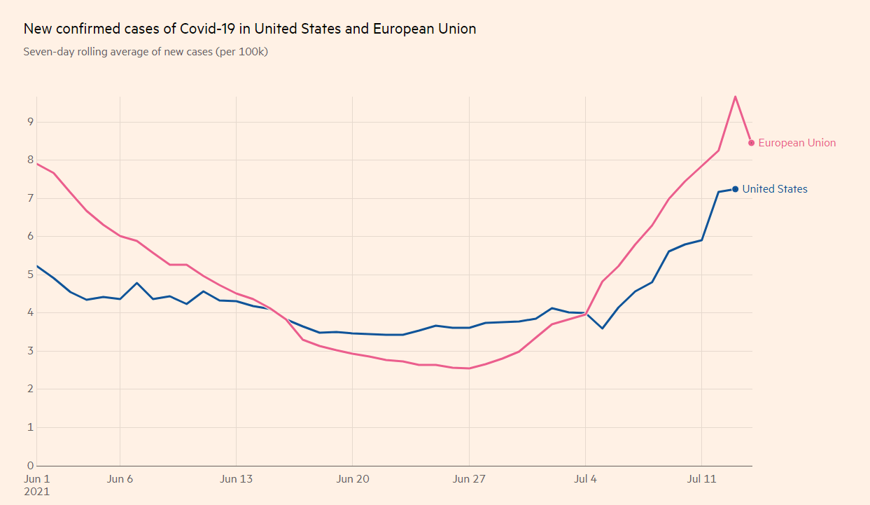 Another factor that could temporarily weigh on the greenback comes from the rapid spread of the Delta covid variant. Cases continue rising in Europe, weighing on the euro. The same is happening in the US and – while it may eventually have a positive impact on the dollar – Powell could respond by warning of its negative impact on the economy, thus weighing on the greenback.