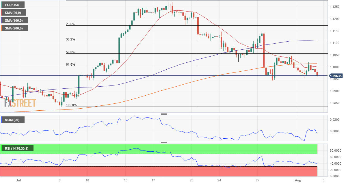 The EUR/USD pair could not recover the 1.1000 threshold, meeting strong selling interest on a peak beyond the mark. The pair currently trades in the 1.0960 price zone, under pressure for a third consecutive day, yet holding above last week’s low at 1.0943. Financial markets turned risk-averse ahead of critical United States (US) figures, with global indexes trading in the red and the US Dollar outperforming its major rivals.