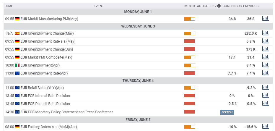 And finally, Non-Farm Payrolls will probably show another massive, multi-million decrease in employment, yet probably better than April's 20.5 million. A significant downward revision for April cannot be ruled out, somewhat dampening any positive surprise in May's numbers.