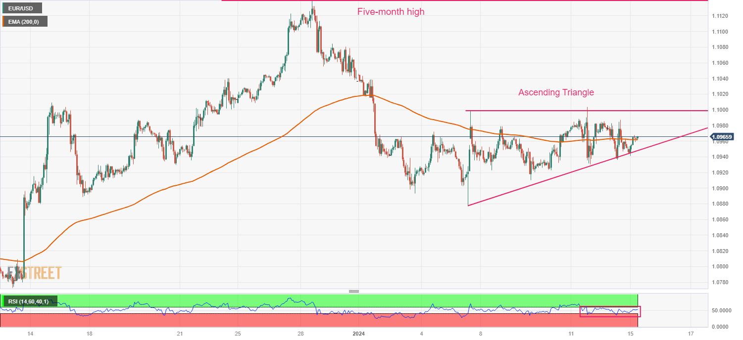 EUR/USD trades in an Ascending Triangle chart pattern on an hourly scale, which indicates a sharp decline in volatility. The upside in the major currency pair remains restricted around the psychological figure of 1.1000 while upward-sloping trendline plotted from January 5 low at 1.0877 is providing support to the Euro bulls.