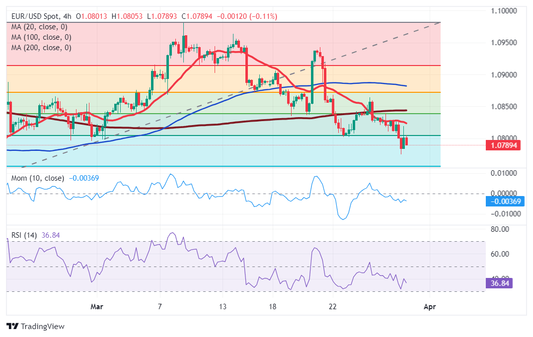 The EUR/USD pair broke below the 1.0800 threshold on Thursday, reaching a fresh March low of 1.0774 during European trading hours. The pair bounced from such a low but retained its negative tone and settled in the 1.0790 price zone. The US Dollar benefited from hawkish Federal Reserve (Fed) comments, as Governor Chris Waller confirmed the central bank is in no rush to trim rates.
