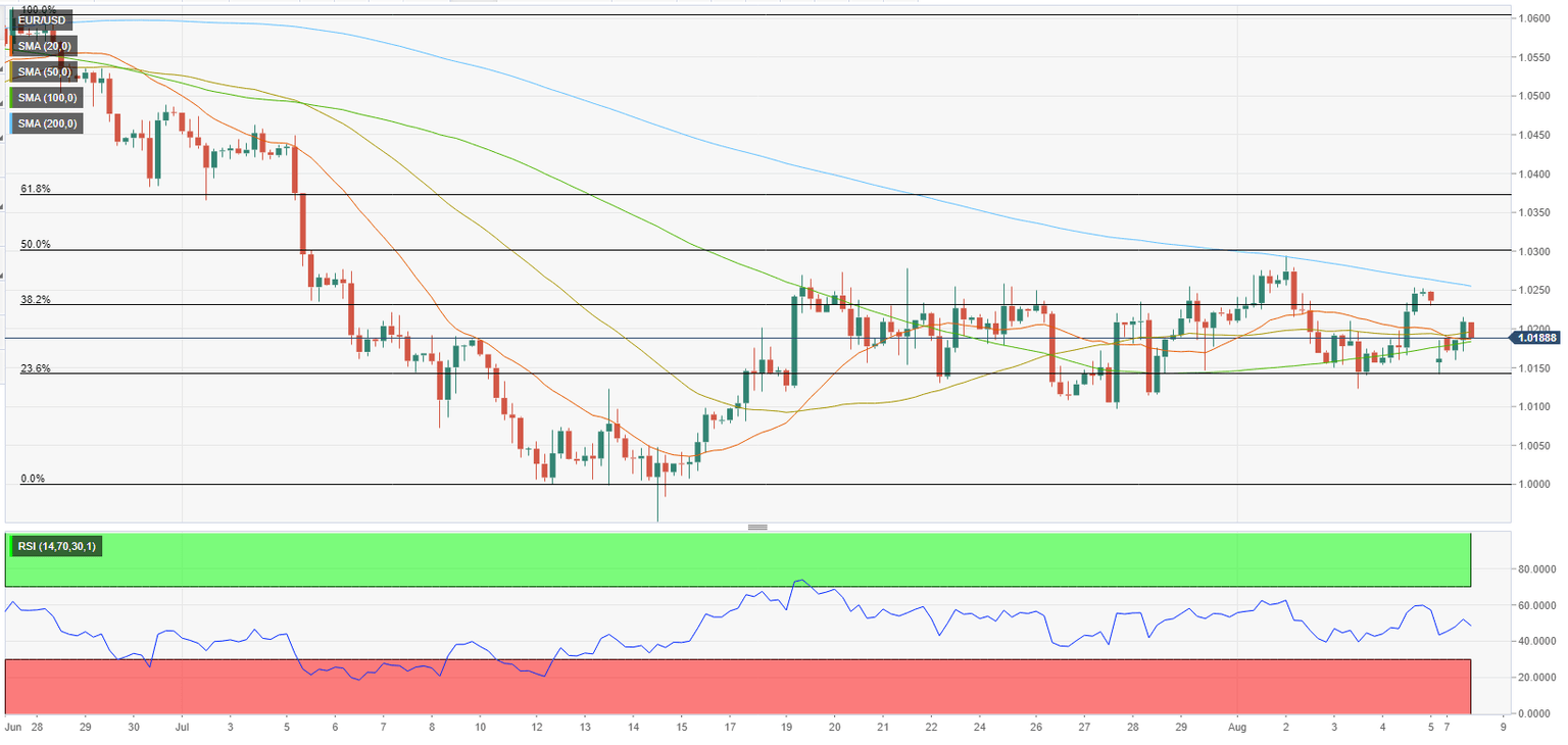 On the downside, additional losses toward 1.0150 (Fibonacci 23.6% retracement) and 1.0100 (psychological level, static level) could be witnessed in case 1.0200 (100-period SMA, 50-period SMA) is confirmed as resistance.