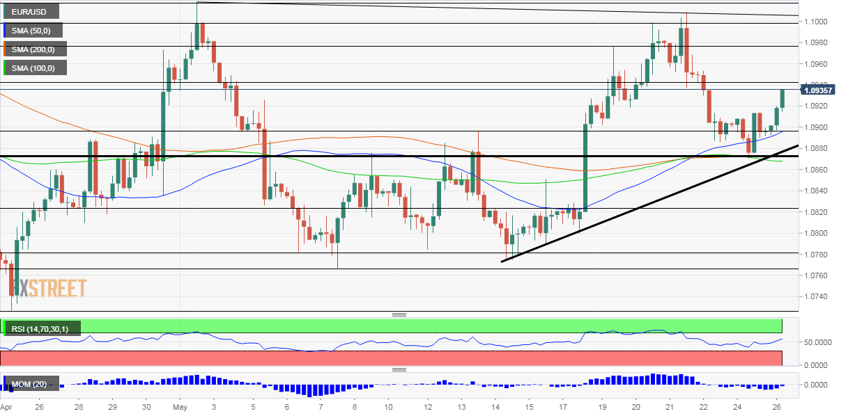 Some resistance awaits at the daily high of 1.0940, which was also a swing high on in early May. It is followed by 1.0970, a swing high from last week, and then by 1.10, a psychologically significant figure.