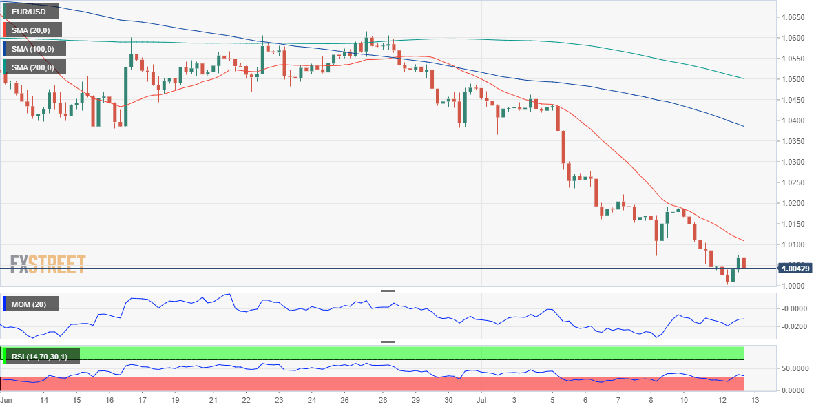 The EUR/USD pair ended Tuesday with modest gains, trading in the 1.0040 price zone. The pair flirted with parity before recovering some ground, trading as low as 0.9999, a level that was last seen in December 2002, when it bottomed at 0.9859. Recession fears kept leading the way, temporarily cooled by a memo from the White House indicating that macroeconomic data from the first half of the year is “not consistent with a recession.”