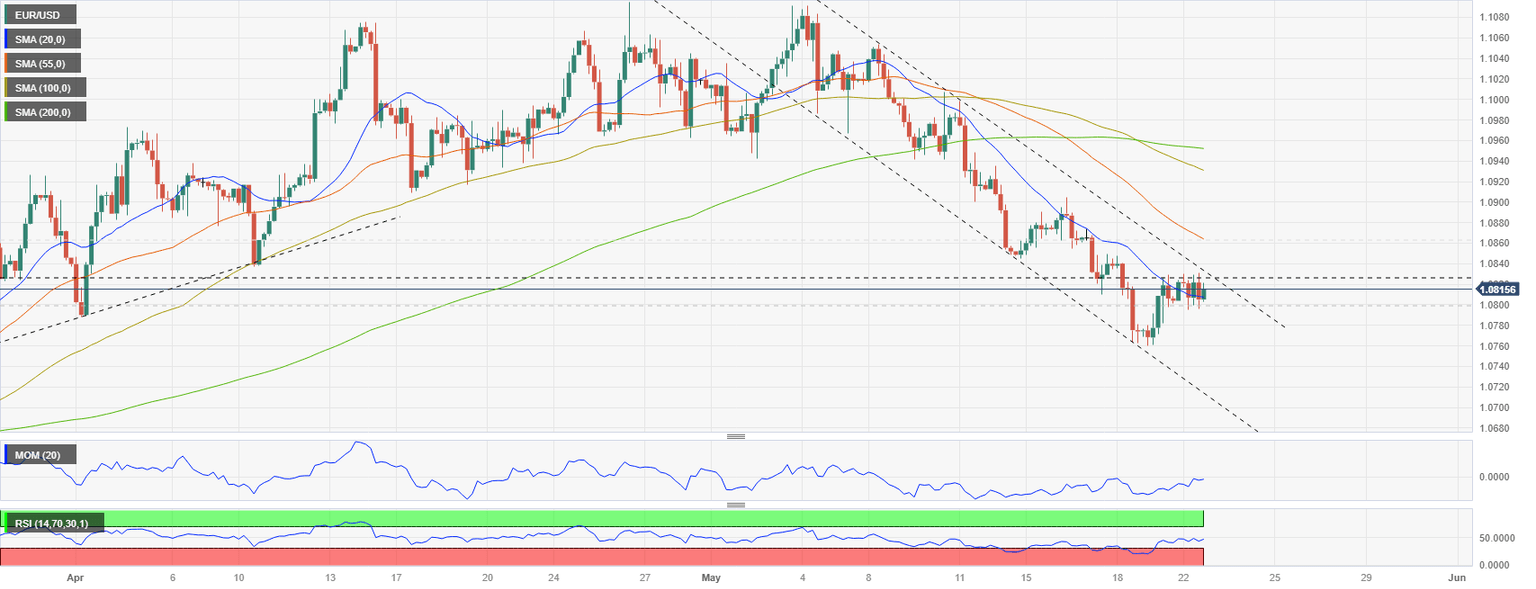 The EUR/USD pair has held steady, showing signs of stability and holding up far from recent lows. However, in the short term, the overall trend remains tilted to the downside, with prices still well below key daily Simple Moving Averages (SMA), except for the 200-day SMA, located at 1.0467. More consolidations are likely into a broader range between the levels of 1.0850 and 1.0780.